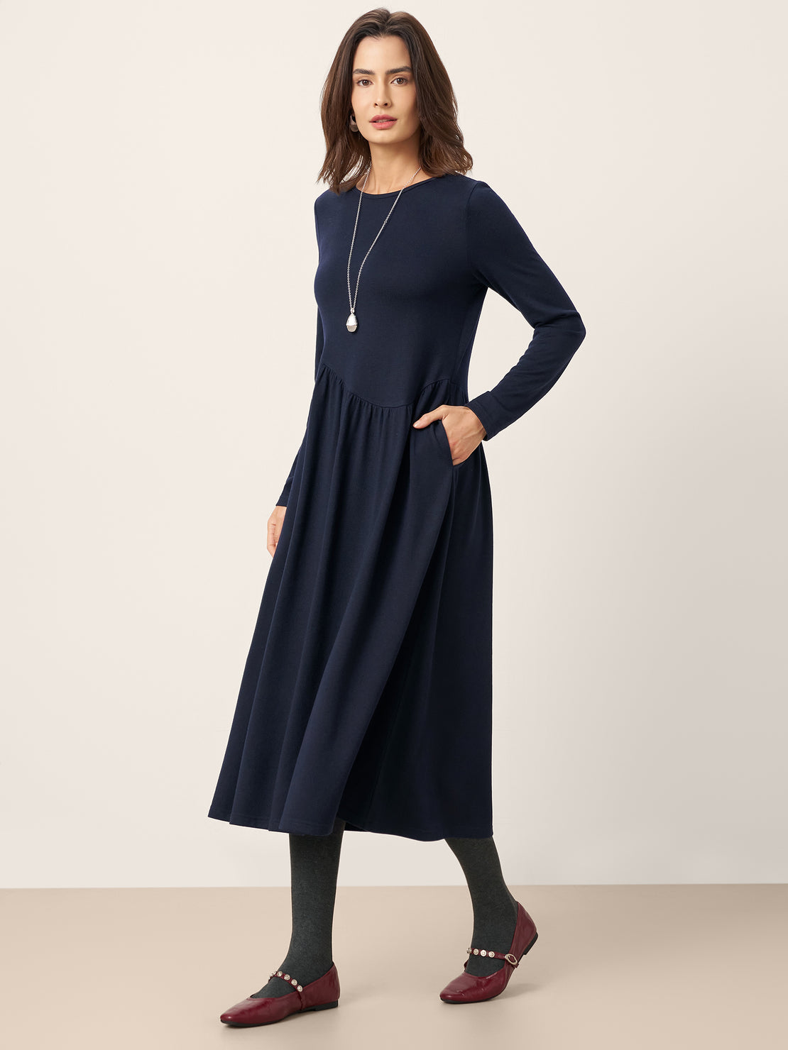 The dress moves naturally with the body and works well for casual days or dressed-up moments.